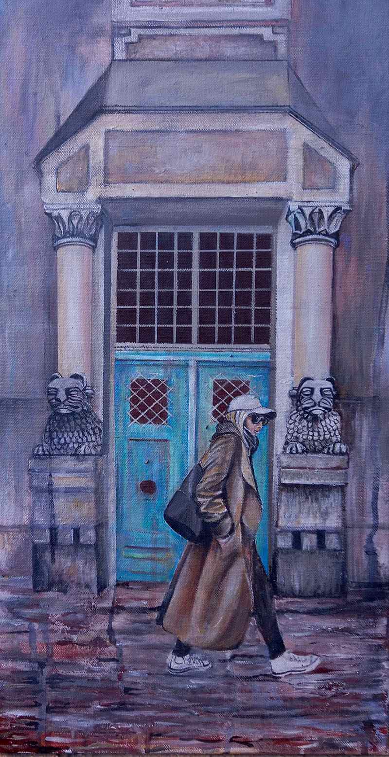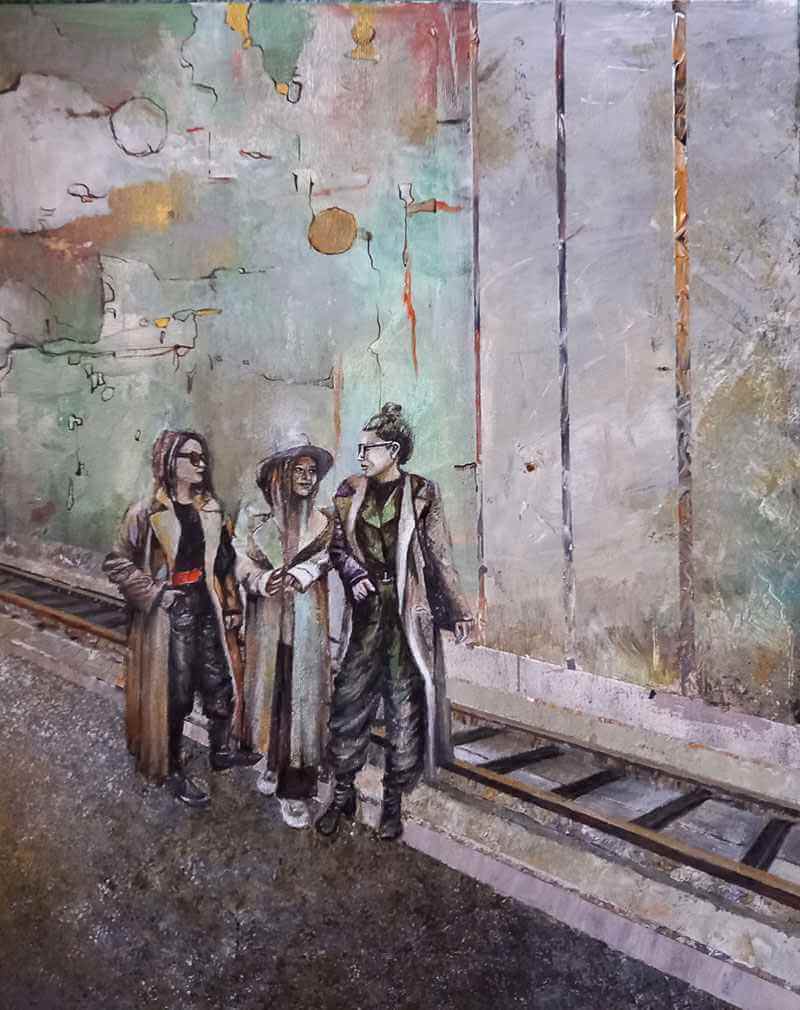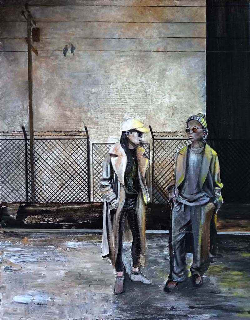 The painting masterfully juxtaposes elements of realism and stylized abstraction, evocative brushstrokes to highlight the figures’ fashionable yet understated attire, bringing focus to the figures’ quiet strength and individuality within a larger landscape. It’s a powerful exploration of choice and contemplation, portraying a moment suspended between past and future, echoed in destroyed future of the city that stretch behind them..