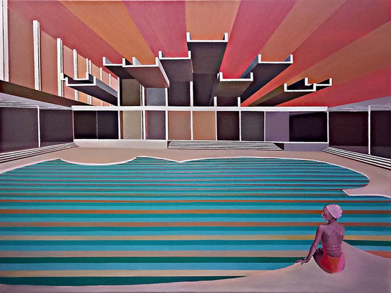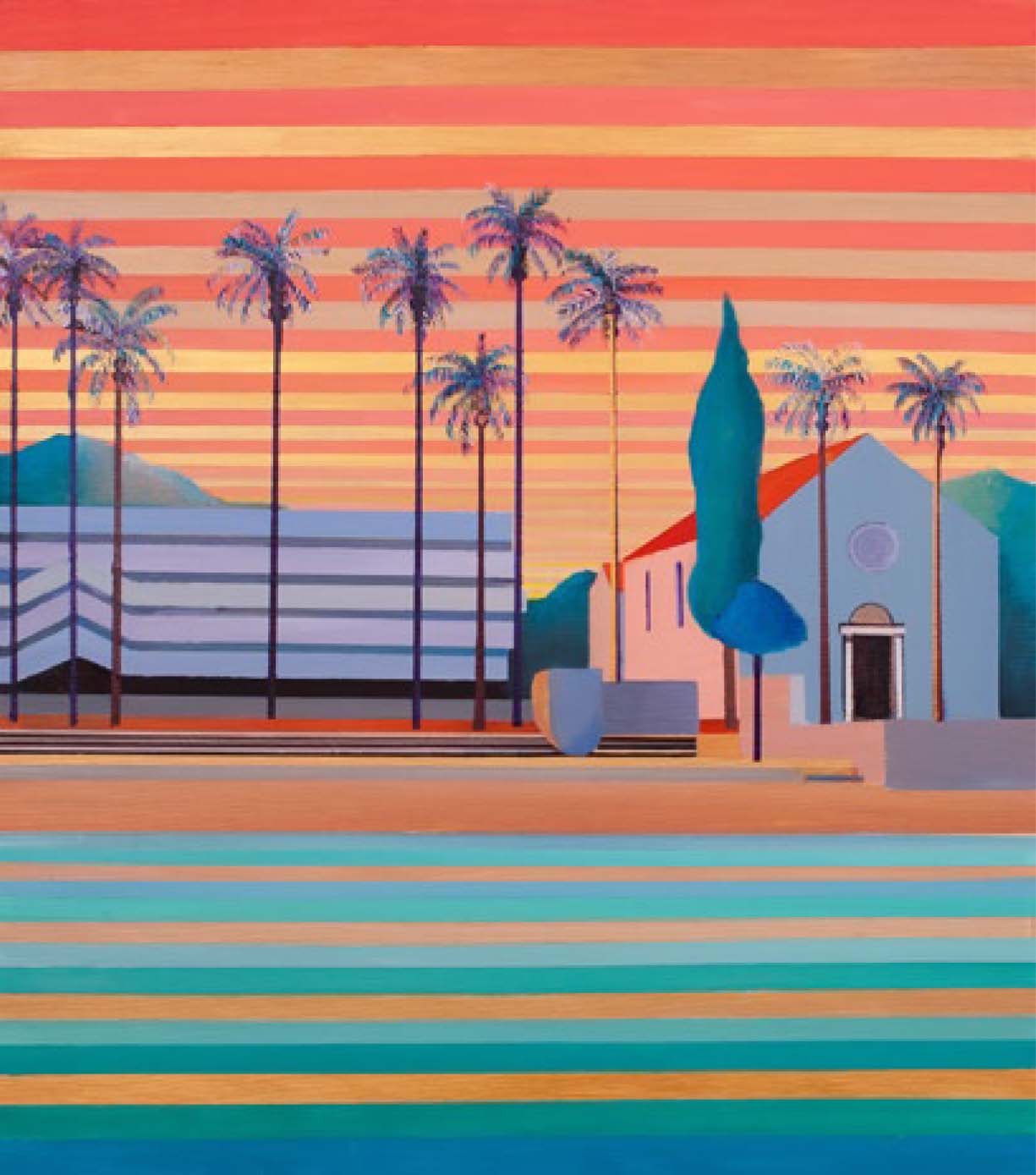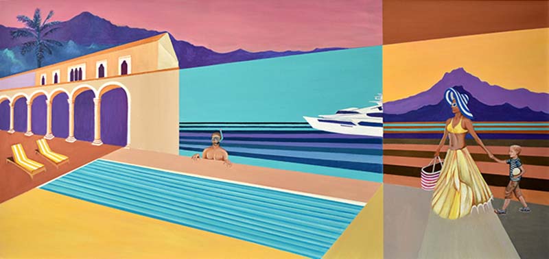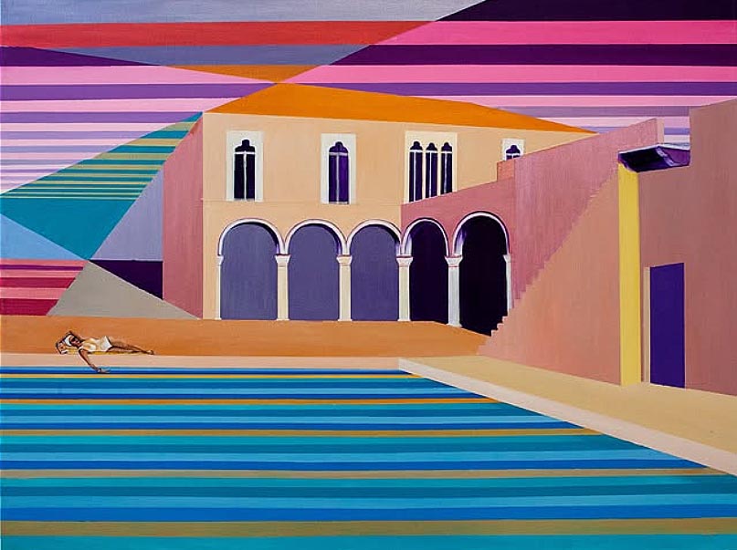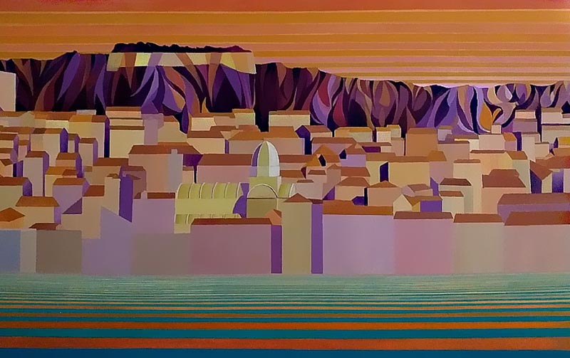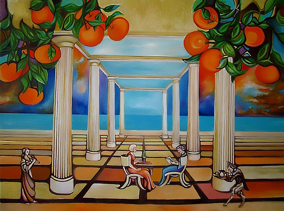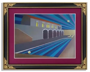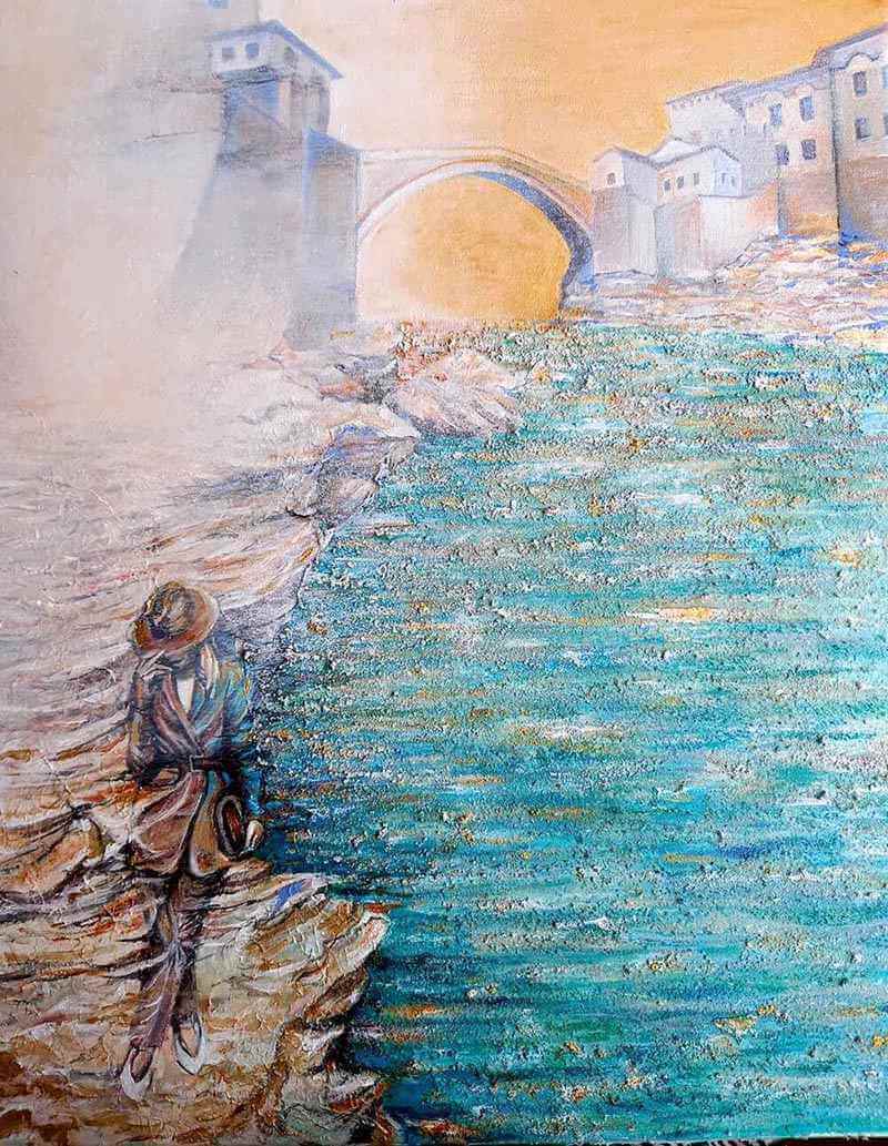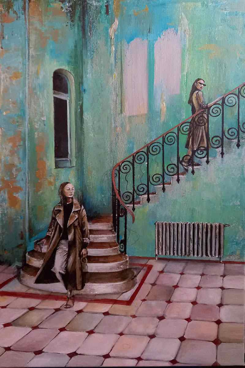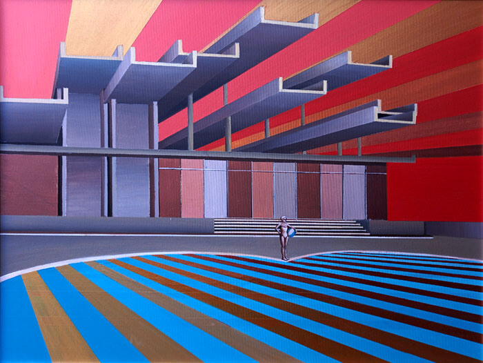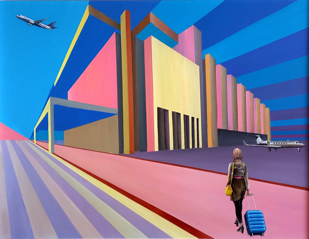 This cycle started in 2018. In this artistic phase of my creative path I find my voice in the bold strokes and vivid hues of acrylics. The medium’s inherent vibrancy becomes a metaphor for the tenacity and assertiveness I seek to channel. My intention to blend architectural compositions, specifically the modern midcentury Croatian vacation architecture, with the historical palaces of Dubrovnik, speaks volumes about my artistic philosophy. The juxtaposition of contemporary design against a backdrop of historical grandeur not only mirrors my own evolution as an artist but also mirrors the world’s intricate interplay between tradition and innovation. This thematic interweaving is a reflection of my aspiration to meld the past with the present, creating a harmonious dialogue that resonates through the canvases.