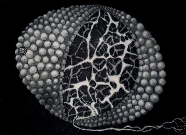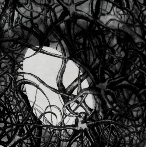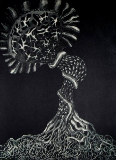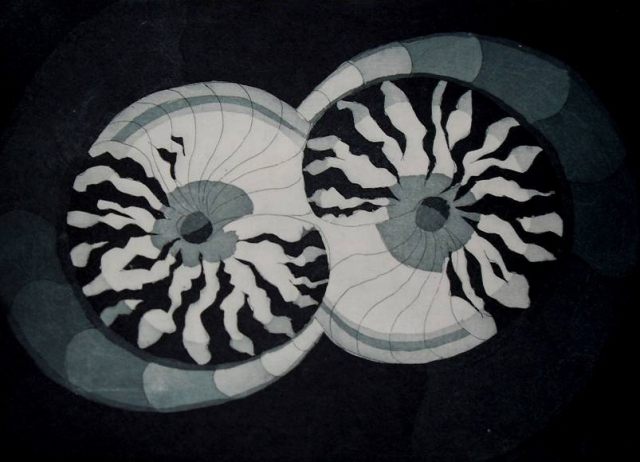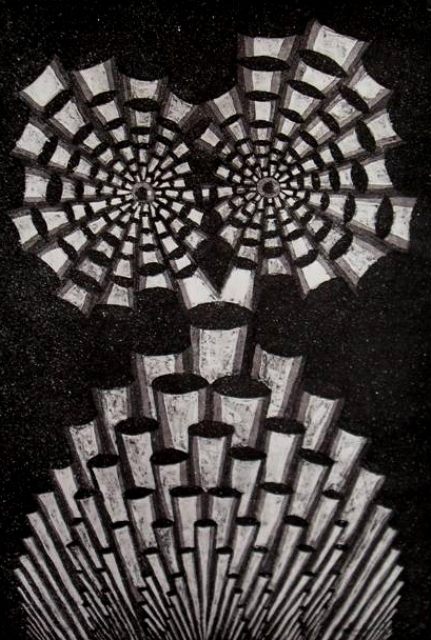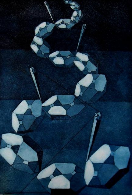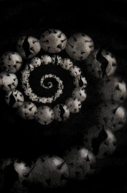 Graphics are made in traditional art printing technics such as etching, dry-point and aquatint. They depict themes of genesis based on modern scientific dogmas and imbued with metaphysical meditation. Through esoteric terms like cosmic egg or tree of life, a story develops itself of emanating life which happened in two directions. From the primordial ocean of creation where all the elements connected themselves creating order from chaos, material universe was placed under the laws of polarity following the rules of fractal iterations. Every level of organization brought a new level of consciousness containing within itself the principles of biology – survival, adaptation, competition and group organization. Although it appears like the human being has evolved from lower life forms, it also seems possible that man derived himself from a higher being, from the realm of pure consciousness in reverse process of evolution.