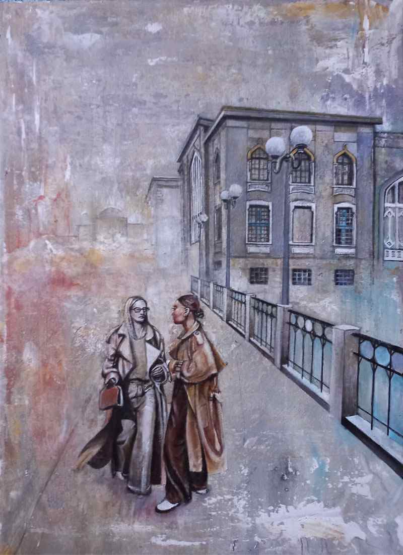 The figures, dressed in chic yet understated streetwear, stand poised against a layered, abstracted backdrop that evokes the muted grays and earthy tones of the urban surroundings. The surface appears deliberately blurred and fragmented, reflecting the women’s introspective mood. Their expressions are thoughtful, hinting at the contemplation of paths not yet taken, while muted tones reflect the raw, gritty environment of the shattered city setting.